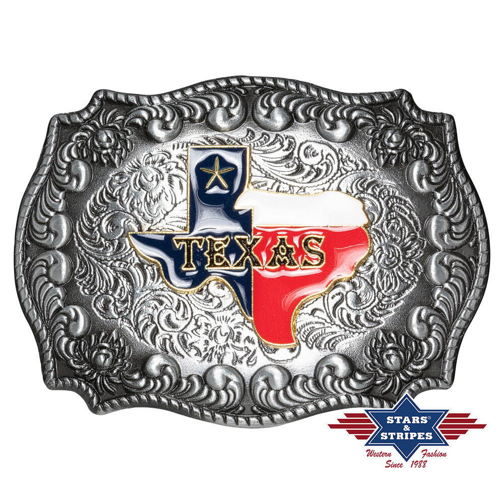 Et flot bæltespænde med staten Texas afbilledet i de amerikanske flags farver. Baggrunden har forskellige smukke emaljeeffekter i en mørk zinklegering.