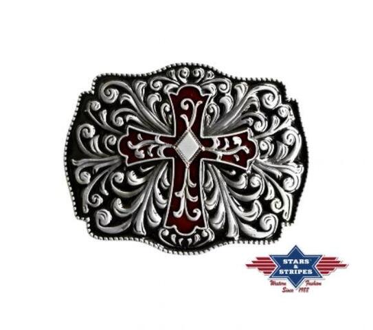 Et smukt bæltespænde med et rødt kors på flotte emaljedetaljer i sort og sølv.