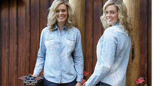 En sød, praktisk langærmet westernskjorte til cowgirls i den skønneste blå- og hvidternede farve, med flot broderi på skuldre og ryg. De påsyede brystlommer kan lukkes med en sød trykknap med en lyseblå simili sten, som matcher knapperne man lukker skjorten med. Skjorten har en lækker satinkant i halsudskæringen