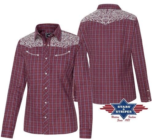 En blød og lækker langærmet westernskjorte til cowgirls i en dyb rød farve med hvide linier, og broderet med snirklede hvide blomster på bryst og ryg. De ensartede ærmegab lukkes med trykknapper, som matcher dem man lukker skjorten med.