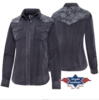 Wilma, western dameskjorte i gråsort forvasket look til cowgirls. På skulder og ryg er den pyntet med lyse blomsterbroderier. Skjorten har to brystlommer med sorte trykknapper, som matcher dem man lukker skjorten med.