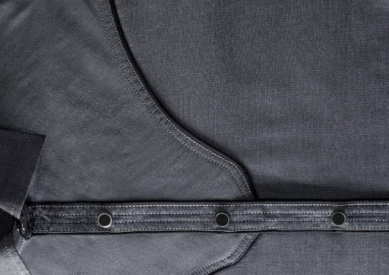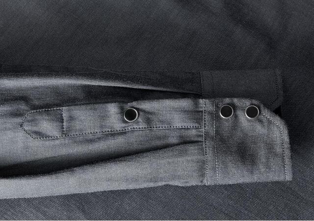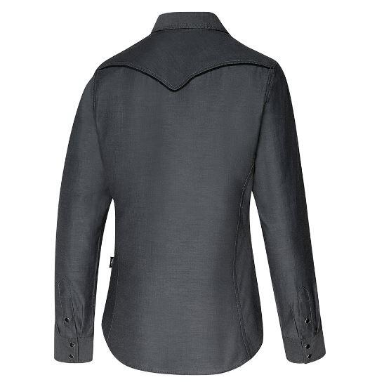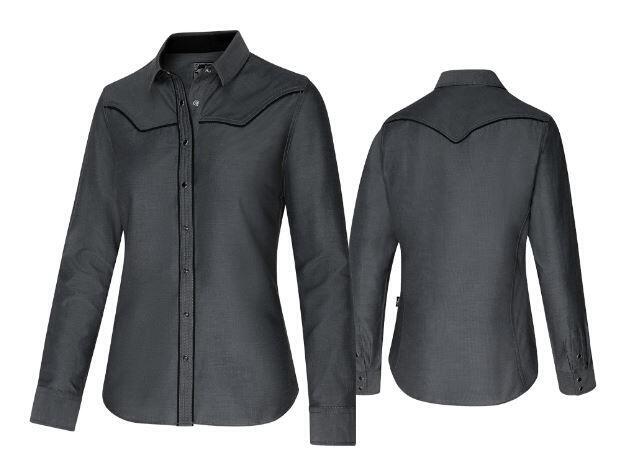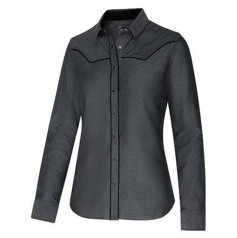 Smart og stilfuld westernskjorte i grå med sorte detaljer til damer. Skjorten har det velkendte western-design på skuldrene. På denne model går syningerne dog helt ned på brystet og ender ved liningen. Sort snor er påsyet langs syningerne på skuldrene og ned langs liningen. Med dekorative sorte trykknapper lukkes skjorten og manchetterne.