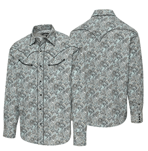 Smart langærmet westernskjorte i detaljeret paisleymønster i en kombination af grå og blå nuancer..
