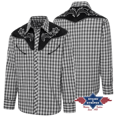 Stars & Stripes, Caleb herreskjorte, sort- og gråternet med imiteret skindskuldre og broderi