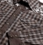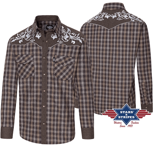 Detaljer: Brunternet western herreskjorte med brunt revers med hvide broderier på bryststykke og ryg, samt brun linning og manchetter. Skjorten afsluttes med marmorerede gyldne trykknapper på brystlommer, langs linningen og på manchetterne
