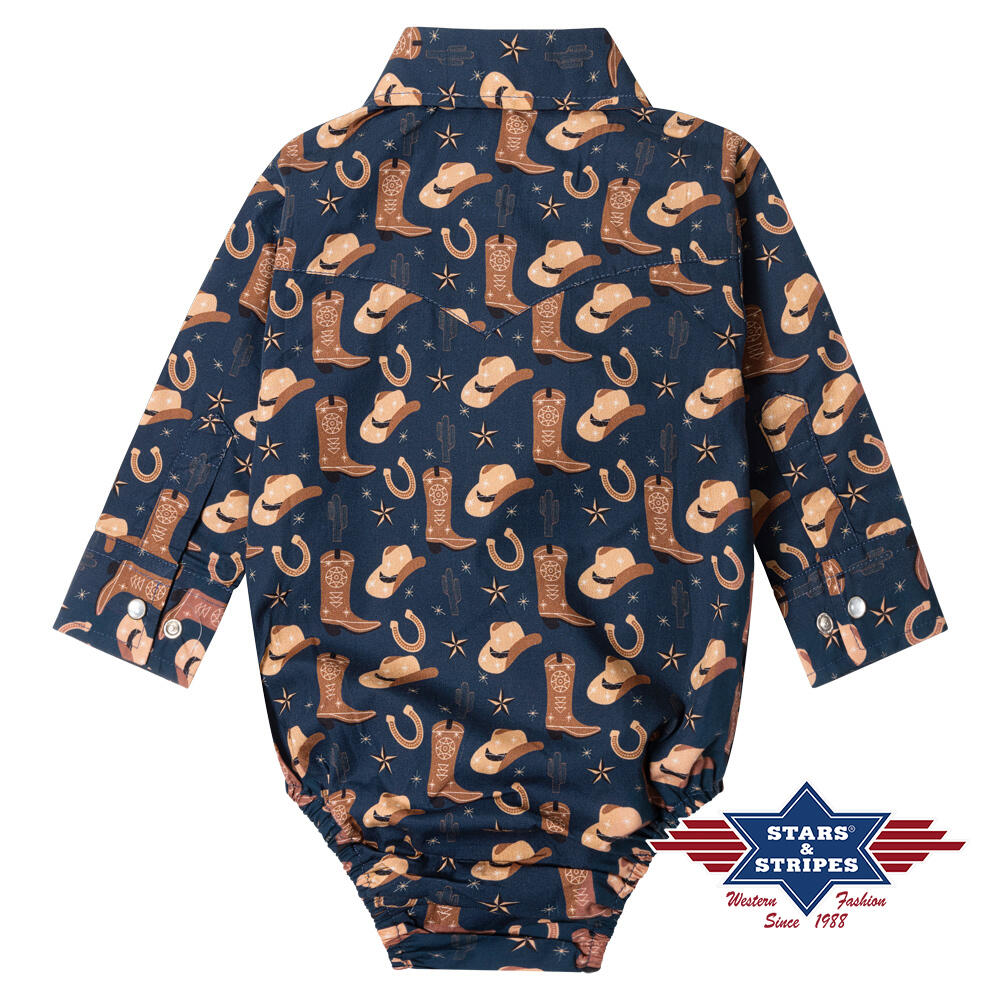 Sød, blå bodystocking til den lille cowboy med sjove brune motiver med bla. cowboyhatte, hestesko og westernsboots. Baby cowboy er udformet som en skjorte i skjortestof,  lukkes med dekorative hvide trykknapper på de 2 brystlommer, skjorteåbningen og på ærmegabene. Bodystockingen lukkes med 3 trykknapper i skridtet og er udstyret med elastik omkring lårene for bedre comfort.