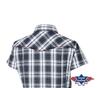 En lækker, ternet, kortærmet western skjorte med påsyede brystlommer, der kan lukkes med en rund trykknap. Skjorten har sødt blomsteret stof på bagsiden af lommerne, knappeliningen og i kraven. Der er en sød dekorativ rød syning på brystlommerne, under skuldrene for og bag og ned langs siden af skjorten. Skjorten har røde og sorte trykknapper.