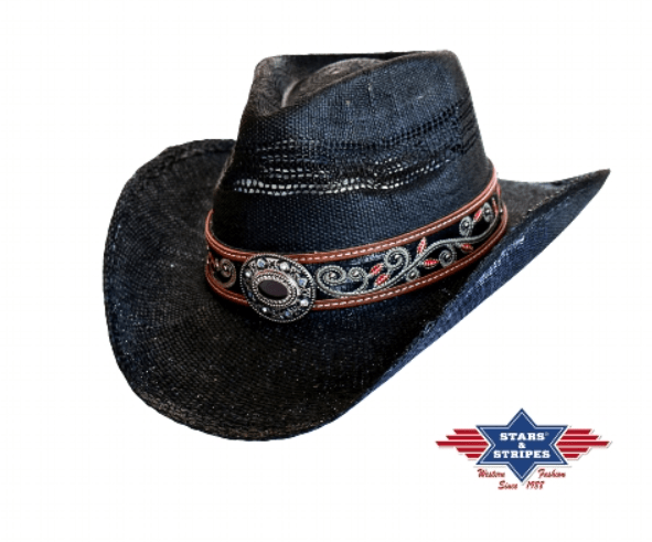 Smuk vintageinspireret westernhat i 100% strå, med et flot blomsterbroderet hattebånd, som har et stort smykke påsat foran, med en sort sten i midten - den perfekte følgesvend til en ægte cowgirl.
