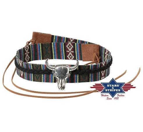 Fuldend westernlooket med dette seje hattebånd i azteker-mønstret stof, pyntet med et longhorn kranie i metalfarve og sort flettet kunstlæder.