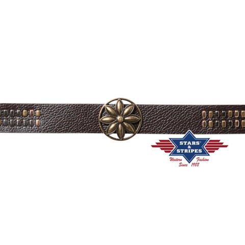 Fuldend westernlooket med dette flotte hattebånd i kunstlæder, pyntet med forskelligt farvede metalnitter og en stor blomsterconcho foran.