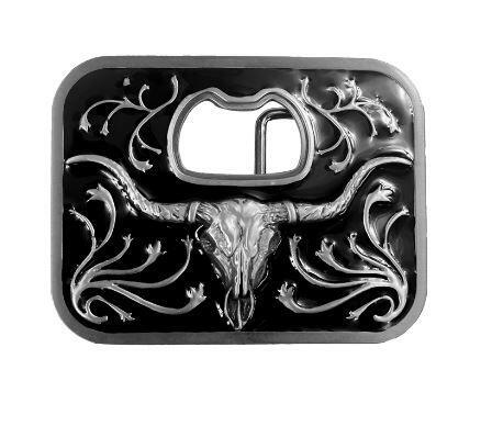 Bæltespændet har en sort baggrund og et udskåret hul, der fungerer som oplukker, ovenover longhorn kraniet