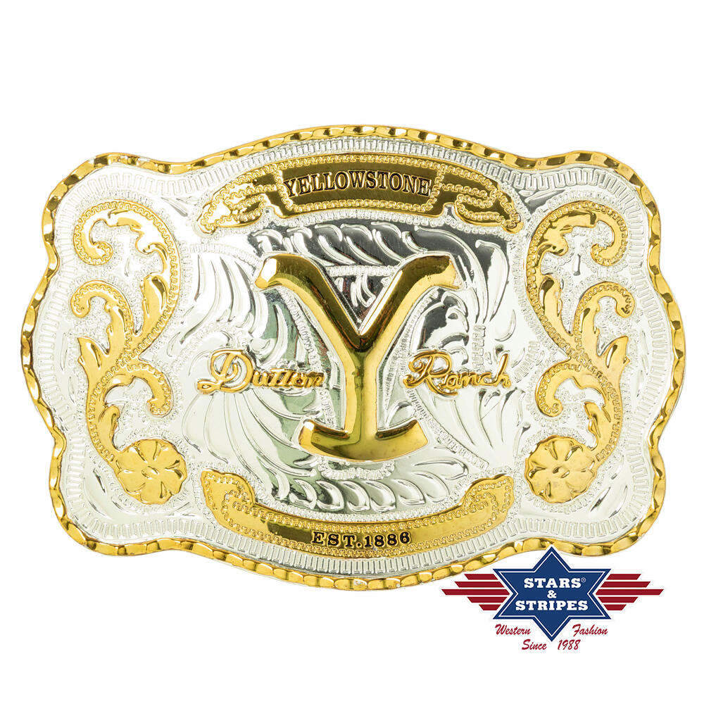 Yellowstone Western bæltespænde med hævet, skinnende guldapplikation formet som Yellowstone-logoet, blomsterelementer og med teksten Yellowstone, Dutton Ranch og est. 1886