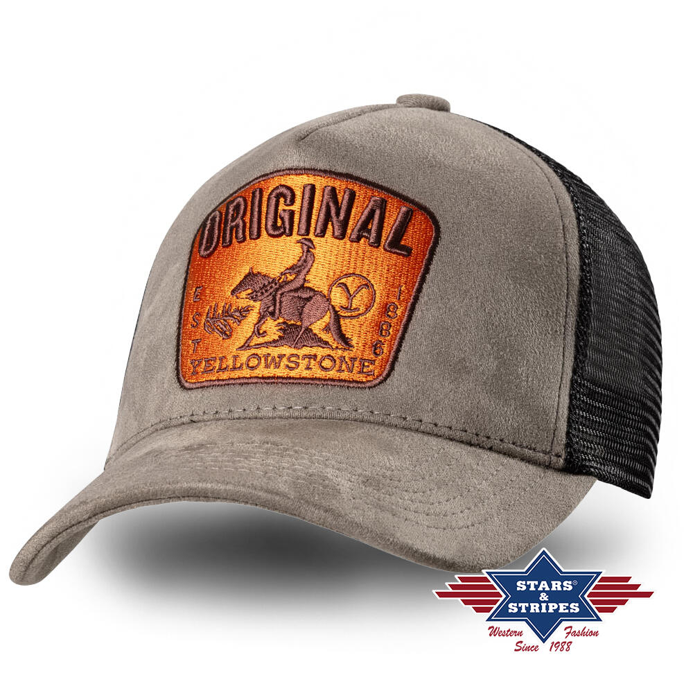 Denne model fås i one-size i ruskindslook med et dekorativt broderet mærke med teksten Yellowstone, est. 1886 og Original